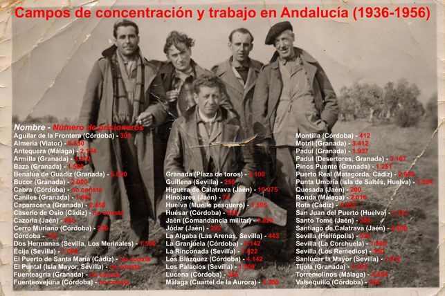 En Andalucia, se dan los primeros campos de concentracion y trabajo forzado en zonas donde ya no hay operaciones militares. Hubo trece instalaciones en Granada, once en Cordoba y Sevilla, ocho en Jaen, cuatro en Cadiz y Malaga, tres en Huelva y uno en Almeria. Alguno, como el de Los Merinales, con diferentes usos hasta 1956, dos decadas despues de iniciada la guerra civil.