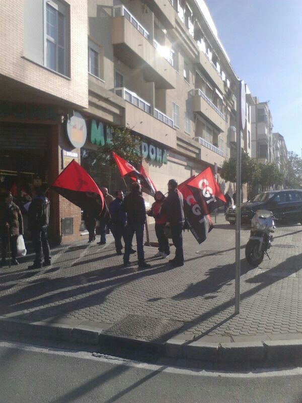 Un grupo de compañeros/as de CGT Sevilla se han concentrado hoy a las puertas del mercadona del Cerro del Aguila, frente