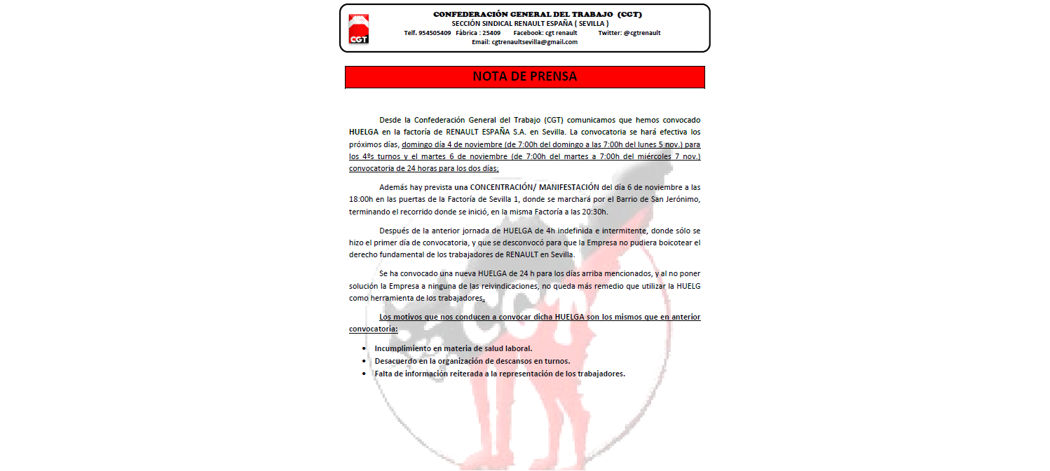 Huelga en Renault Sevilla el proximo 4 de Noviembre. Por nuestra Salud, descansos y trabajo dignos.
