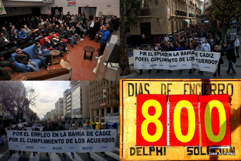 Trabajadores. La Semana Santa de aquel ano, como antes ocurrio en el Carnaval, se inundo de lazos amarillos en los pasos (color elegido para la reivindicacion Delphi). Marchas de mujeres, caminata hasta Sevilla, apoyos de todos los colores. Manuel Chaves en Cadiz y Jose Luis Rodriguez Zapatero en Sevilla no se cansaron de repetir en aquellos dias de campana electoral lo de «no os vamos a dejar tirados». Aun resuenan esas palabras hoy en las grabaciones que conservan los ex Delphi. Incluso una huelga general solo en la Bahia de Cadiz, el 18 de abril de 2007, que fue un rotundo exito. Cerro hasta El Corte Ingles, senalaban entonces los sindicatos, convirtiendo a esta senera marca en el simbolo del triunfo.
