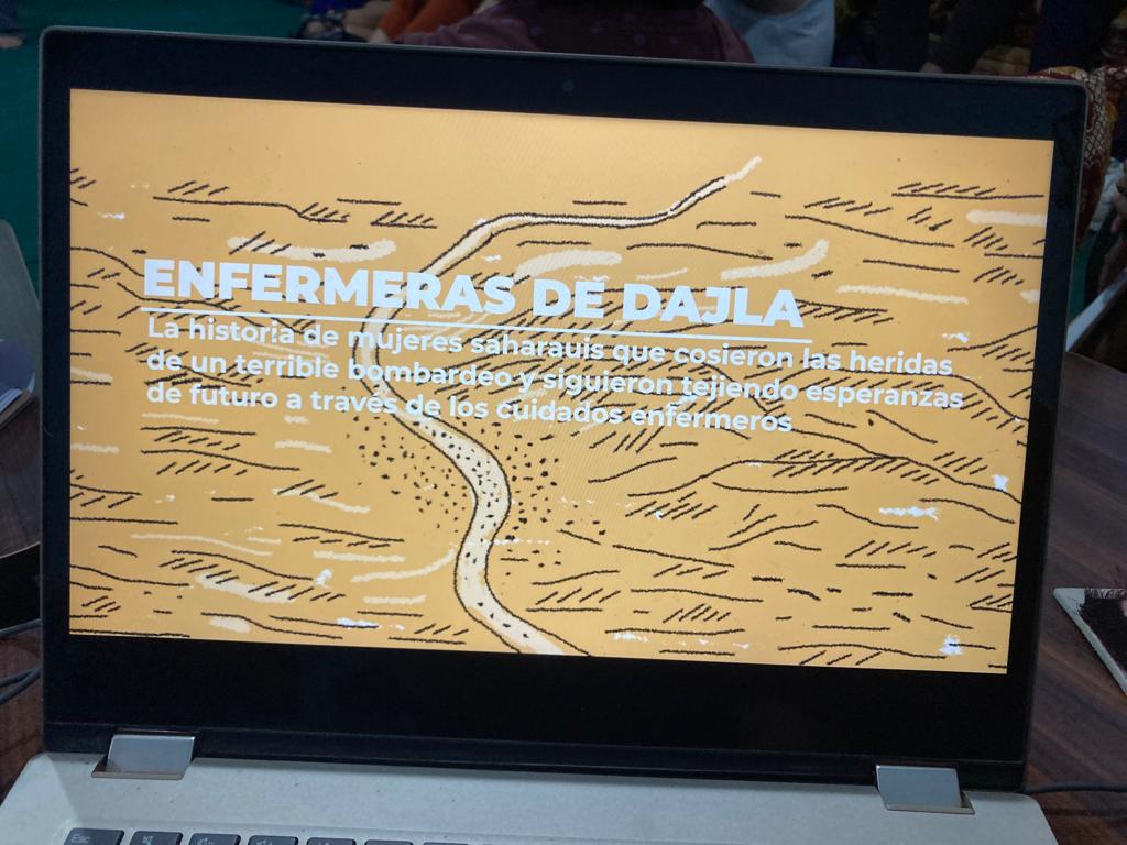 La tarde la hemos invertido en un homenaje a la labor de las enfermeras que trabajan en estos campamentos, con la visualización del documental Enfermeras de Dajla, que ha sido elaborado en colaboración con la Universidad de Sevilla, la Universidad de Tifariti, AAPSS, MLRS, la Escuela de Enfermería de Dajla y la Escuela de Cine “Abidin Kaid Saleh”.